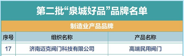 近日,濟(jì)南市第二批"泉城好品"名單正式公布,玫德集團(tuán)旗下邁克閥門憑借卓越的產(chǎn)品品質(zhì)和創(chuàng)新能力成功入選。這一榮譽(yù)不僅是對(duì)企業(yè)實(shí)力的肯定,也是玫德集團(tuán)六十余年匠心堅(jiān)守的又一注腳。