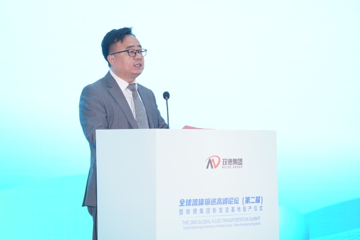 中國城鎮供水排水協會副會長宋蘭合在致辭中強調了保障城市水系統安全穩定運行的重要性,并對玫德集團“短流程50萬噸球墨鑄管智能制造項目”的投產表示祝賀。他指出,高性能流體輸送產品是保障城市水網韌性與安全運行的關鍵基礎,期待通過行業合作推動技術進步。
