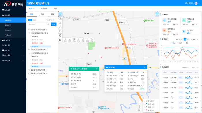 平臺自動采集并動態更新泵房數量、設備總量、服務用戶等基礎數據,實時計算設備在線率、水質合格率、能耗效率等關鍵運營指標。一鍵生成日/月/年運行分析報告,支持設備能效排名與對標。